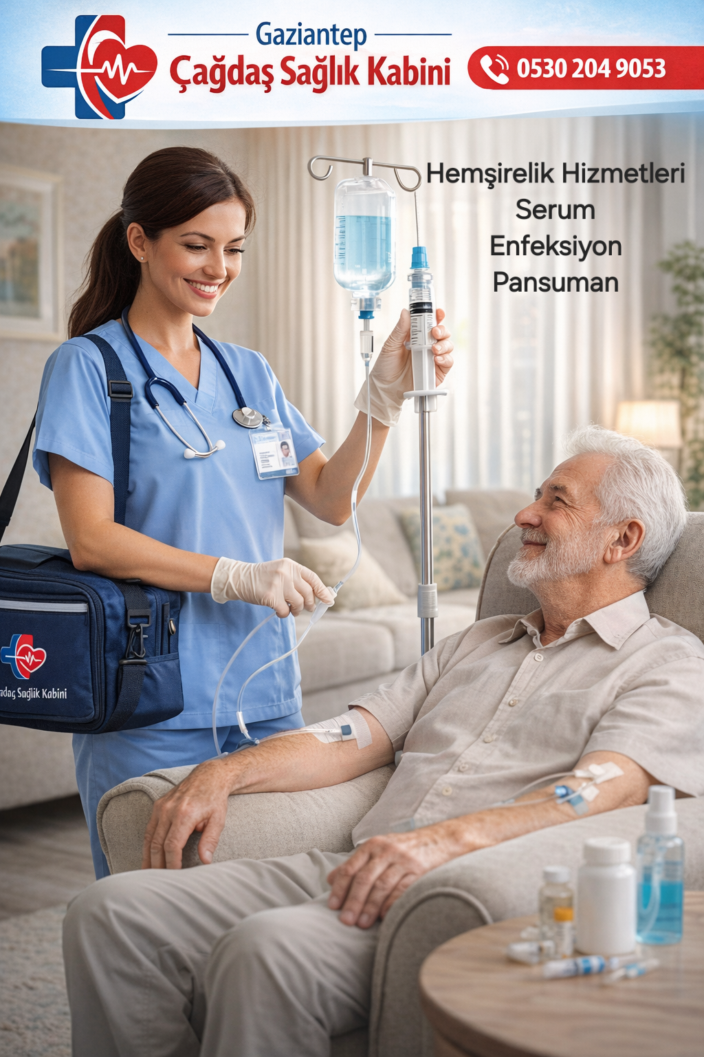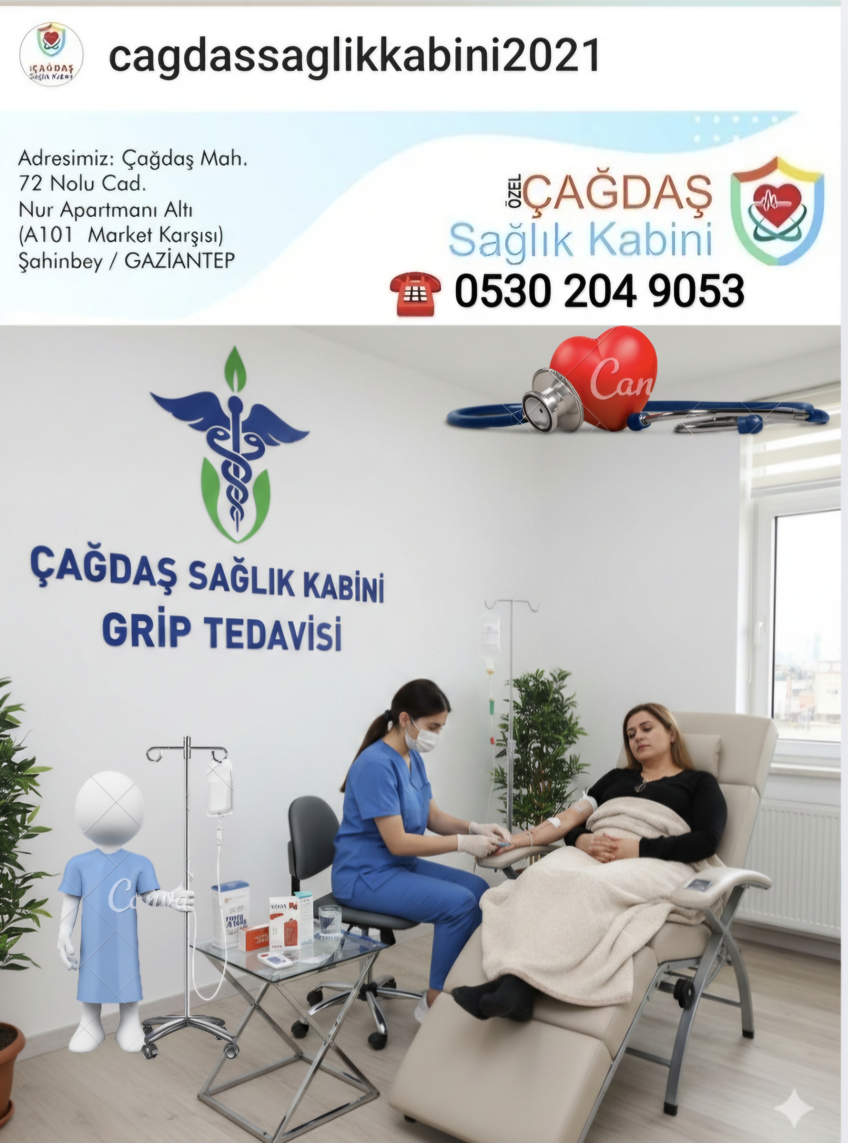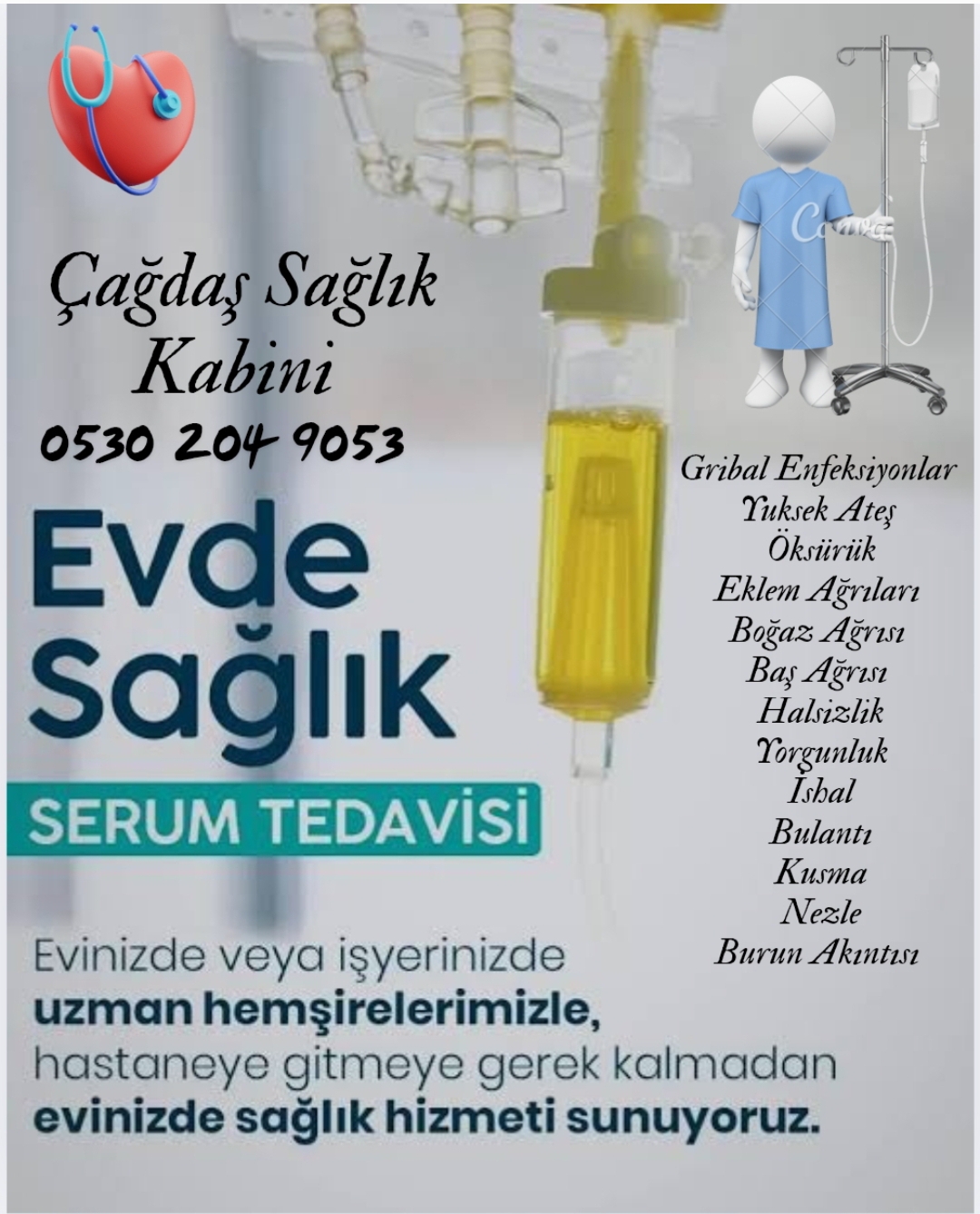 Çağdaş Sağlık Kabini ve Evde Sağlık ve Evde Serum Hizmetleri Tüm Misafirlerimize Dostlarımıza Hastalarımıza Kliniğimizde Evde İş Yerinizde Sağlık Hizmetleri Serum Hizmetleri Hemşirelik Hizmetleri Tedavi Hizmetleri Vermekteyiz 0530 204 9053