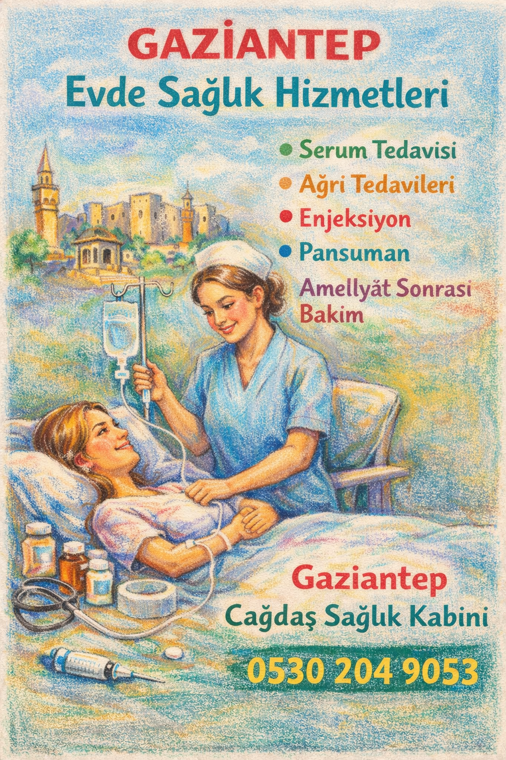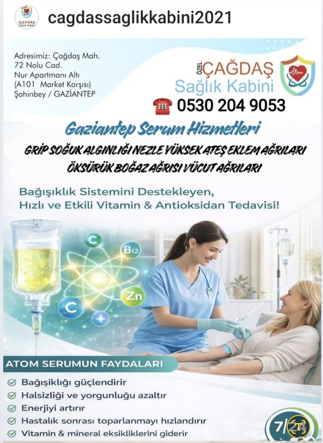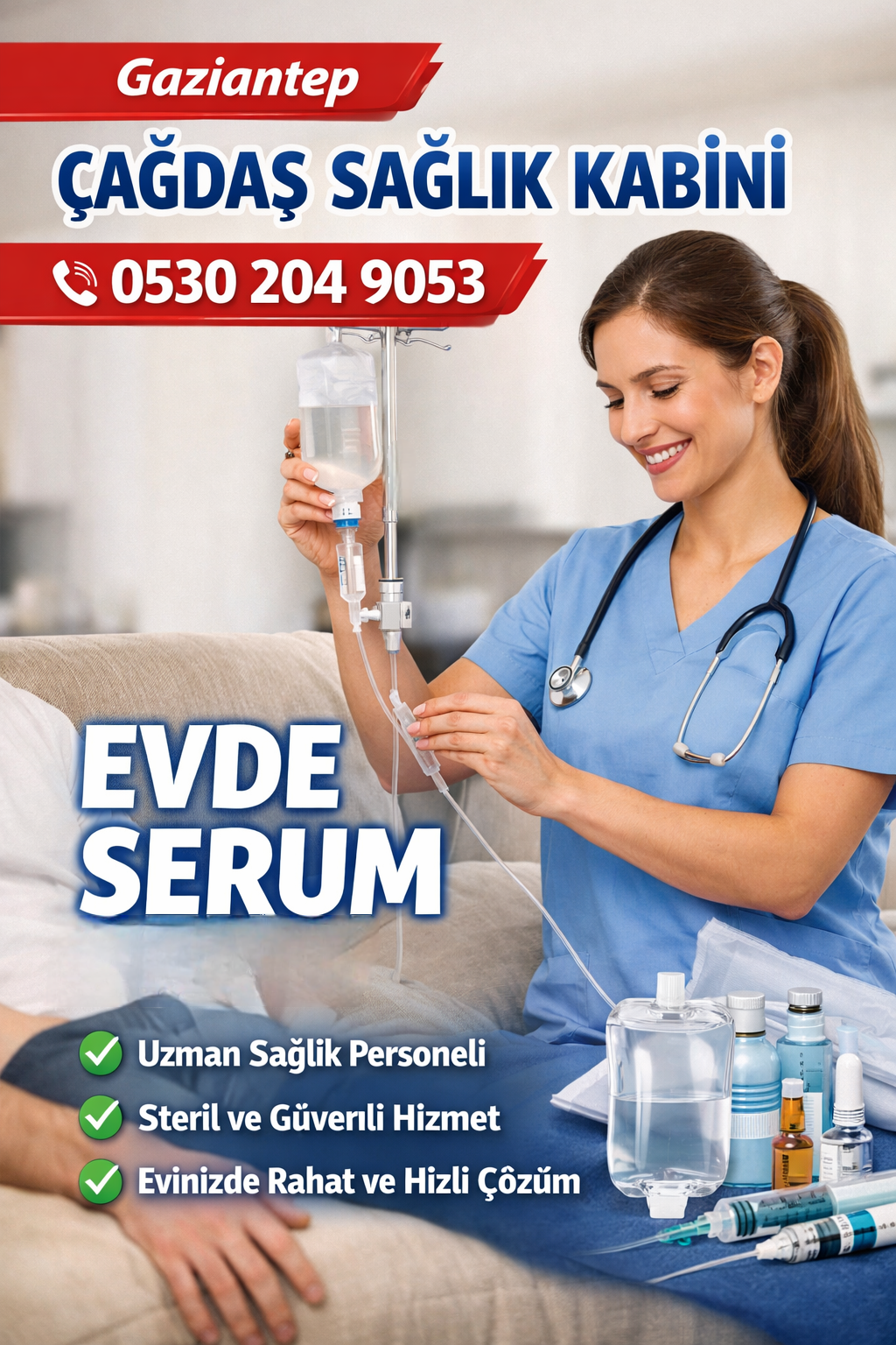 Çağdaş Sağlık Kabini ve Evde Sağlık ve Evde Serum Hizmetleri Tüm Misafirlerimize Dostlarımıza Hastalarımıza Kliniğimizde Evde İş Yerinizde Sağlık Hizmetleri Serum Hizmetleri Hemşirelik Hizmetleri Tedavi Hizmetleri Vermekteyiz 0530 204 9053
